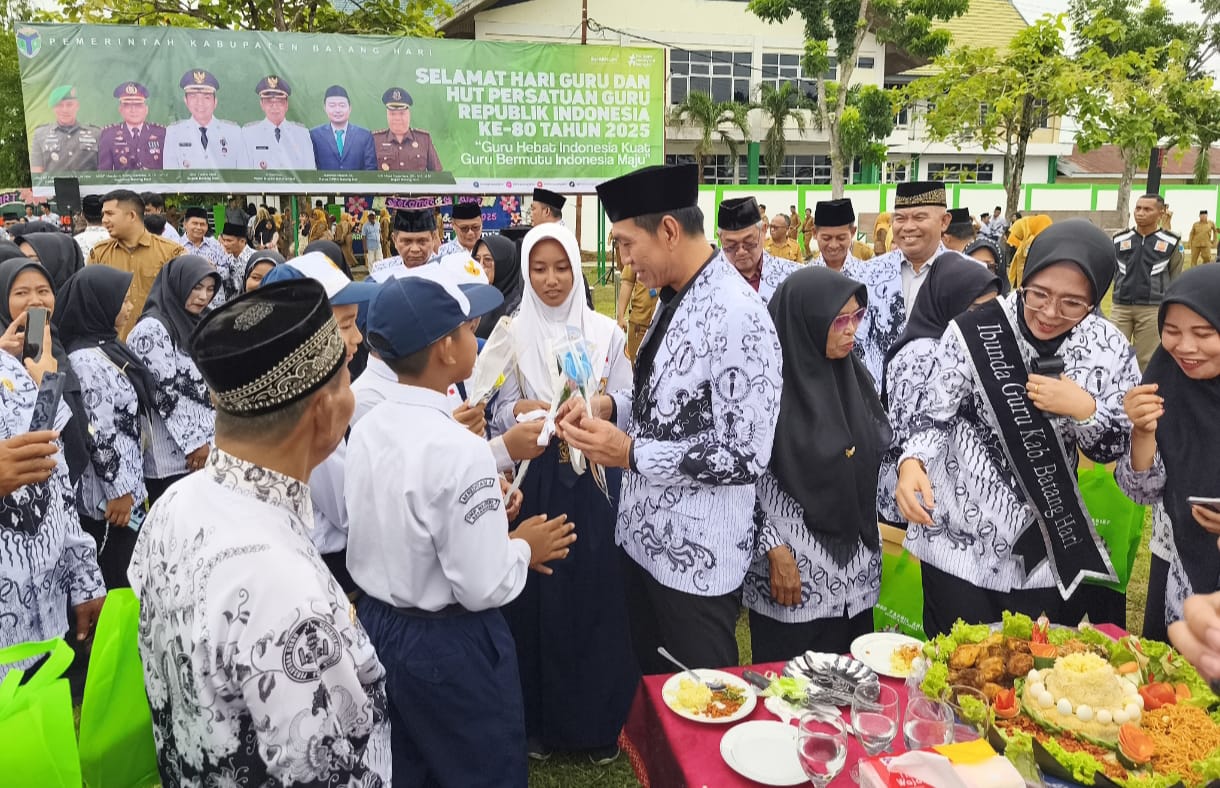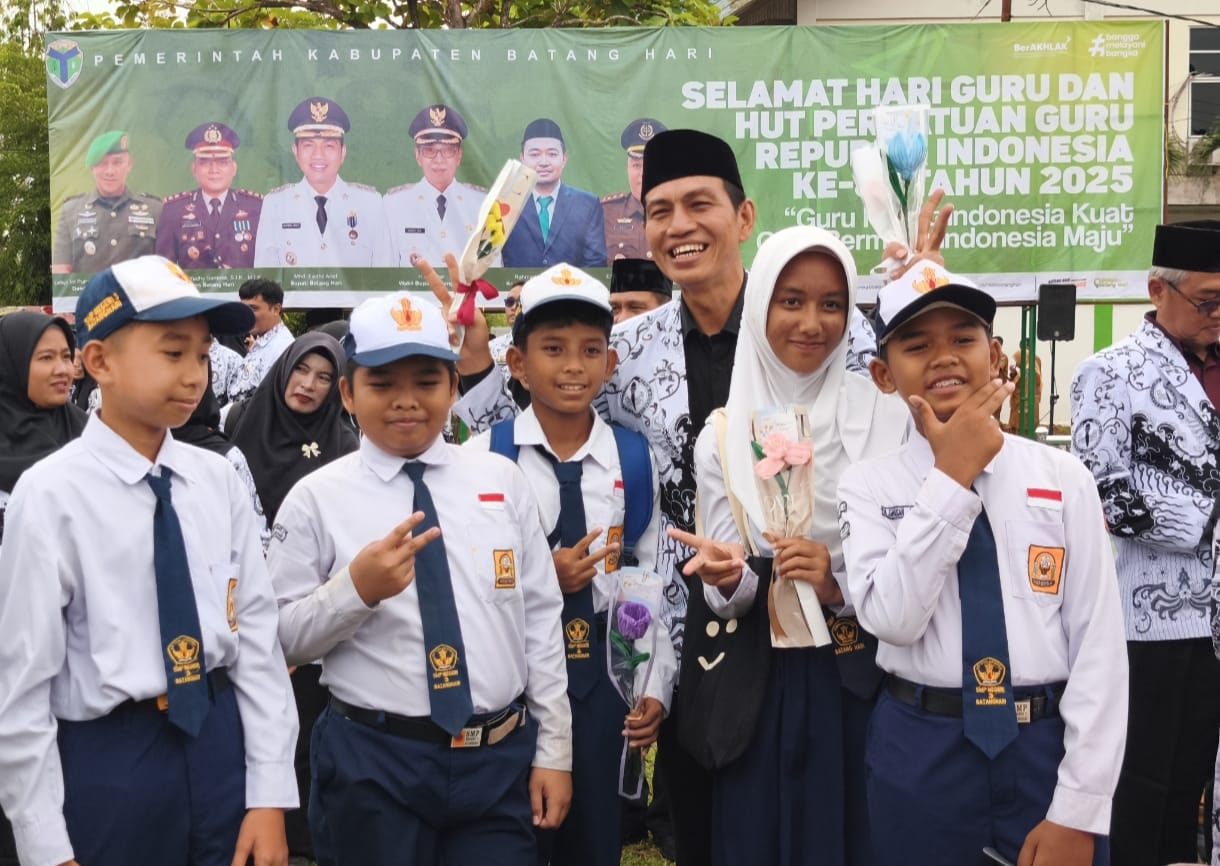 Te-Minutes – Sebuah momen hangat mewarnai suasana usai upacara peringatan Hari Guru Nasional dan HUT ke-80 PGRI yang digelar di lapangan Alun-Alun Kabupaten Batang Hari, Selasa, 25 November 2025. Ribuan peserta yang memenuhi lapangan dan menyaksikan prosesi pemotongan tumpeng oleh Bupati, Bunda Literasi dan Ketua PGRI tampak sekelompok siswa SMP tiba-tiba berlari kecil menuju Bupati Batang Hari, Mhd Fadhil Arief, sembari membawa bunga berwarna-warni yang mereka genggam dengan hati-hati.
