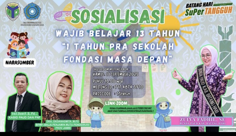 Te-Minutes – Bunda PAUD Kabupaten Batang Hari, Zulva Fadhil, melaksanakan sosialisasi secara virtual melalui Zoom Meeting mengenai program 13 Tahun Wajib Belajar atau satu tahun pra-sekolah pada Kamis, 11 September 2025.